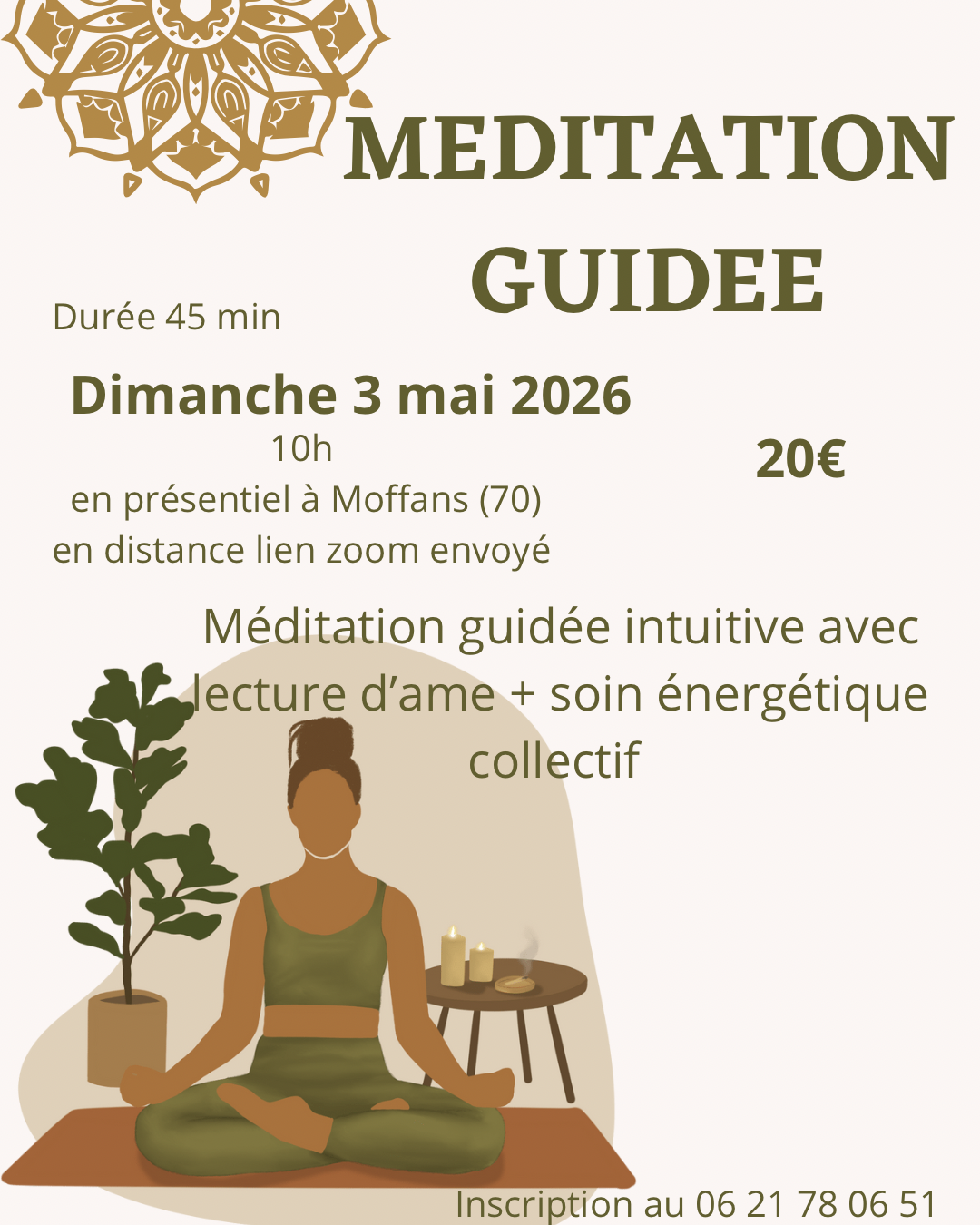 A Moffans dans la salle de méditation ou en distanciel par un lien de l'application zoom.